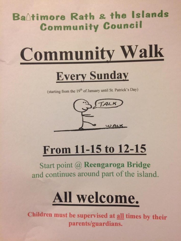 Get you walking shoes on and join Baltimore community council every Sunday for the next ten weeks, starting Sun 19th. Meeting at Reengaroga bridge at 11.15. Walk lasts one hour approx. Children must be supervised at all times please and dogs on leashes. All welcome so spread the word 🙂