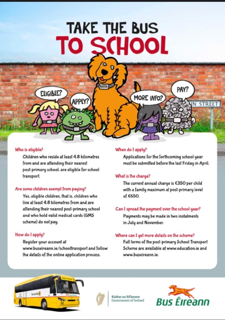 School bus applications are open now online check out http://www.buseireann.ie/schooltransport This applies to all pupils starting post primary too.
