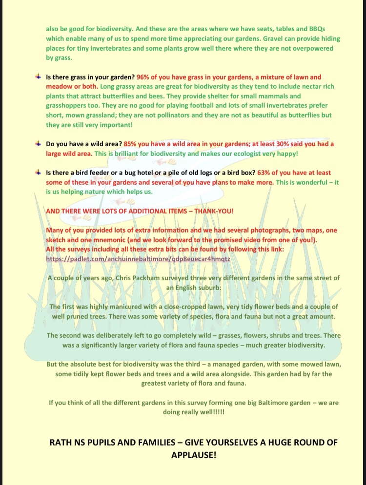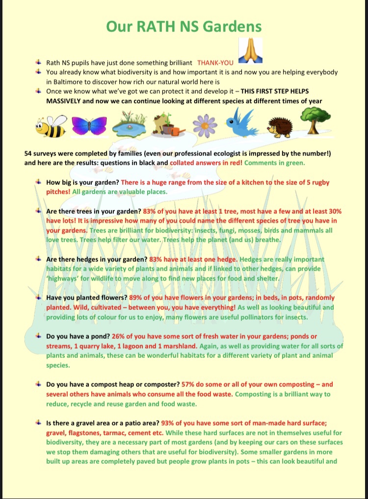 We are delighted to be working with Jonnie and Baltimore Tidy Towns on their biodiversity project in the locality. We love all creatures great and small in Rath NS and the children loved exploring our own garden for mini beasts. Families also completed a garden survey of their own gardens and Jonnie was delighted with our efforts. We will begin survey number two this week on flora & fauna in our gardens. If anyone would like to find out more information or participate in this project please contact Jonnie at +353871120721 and check out their padlet link here: