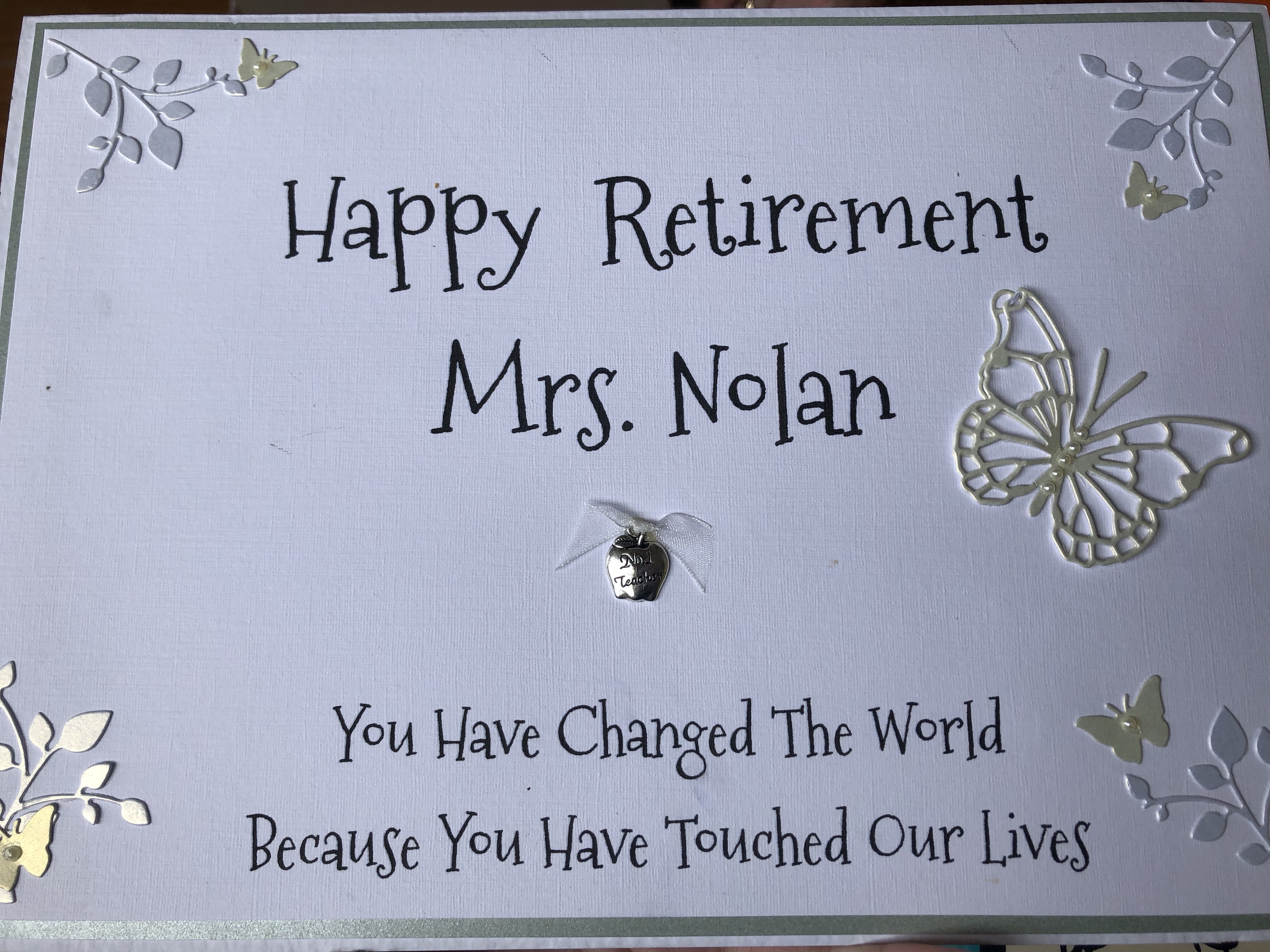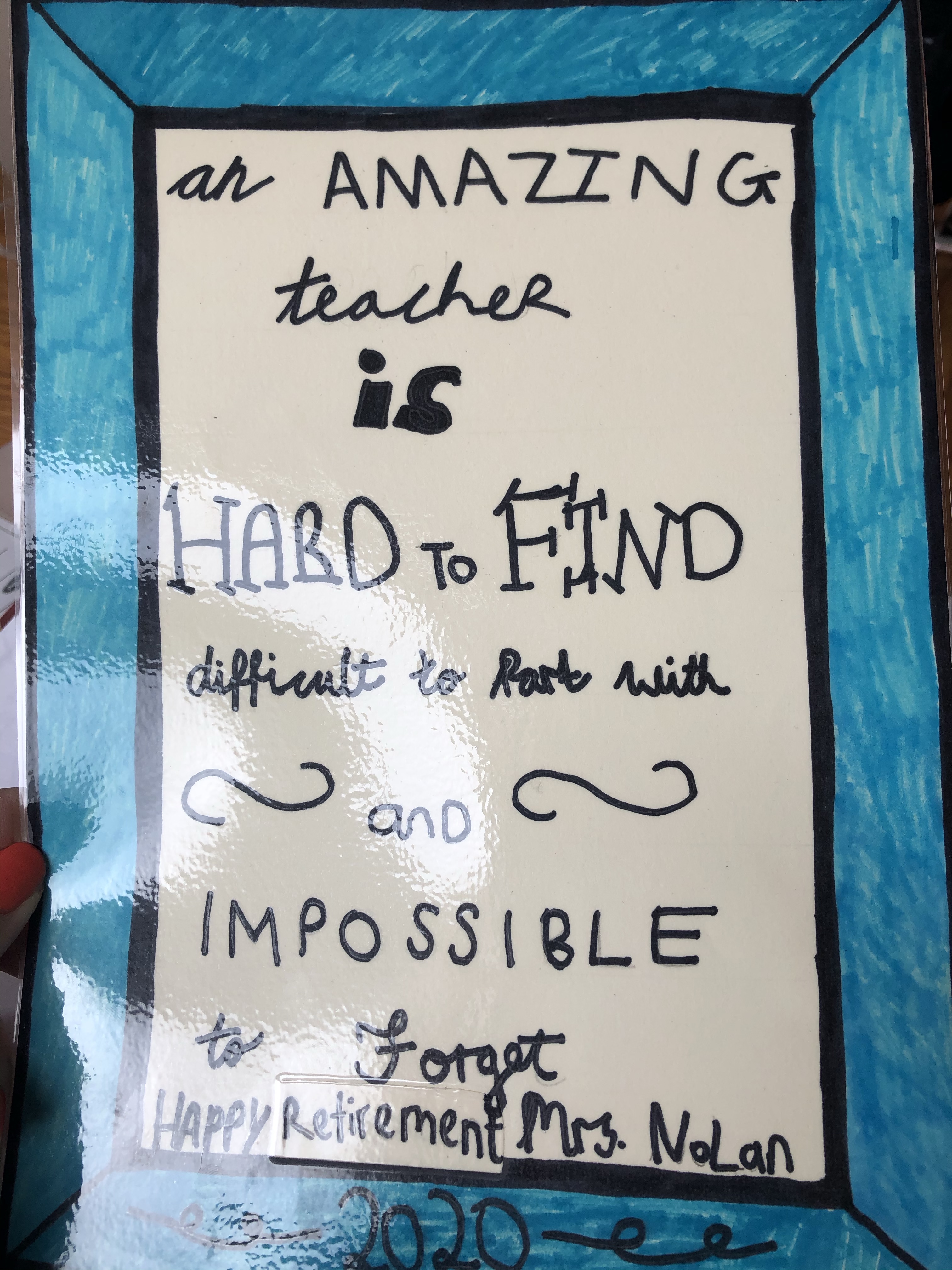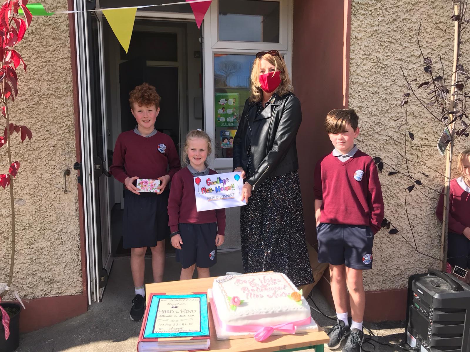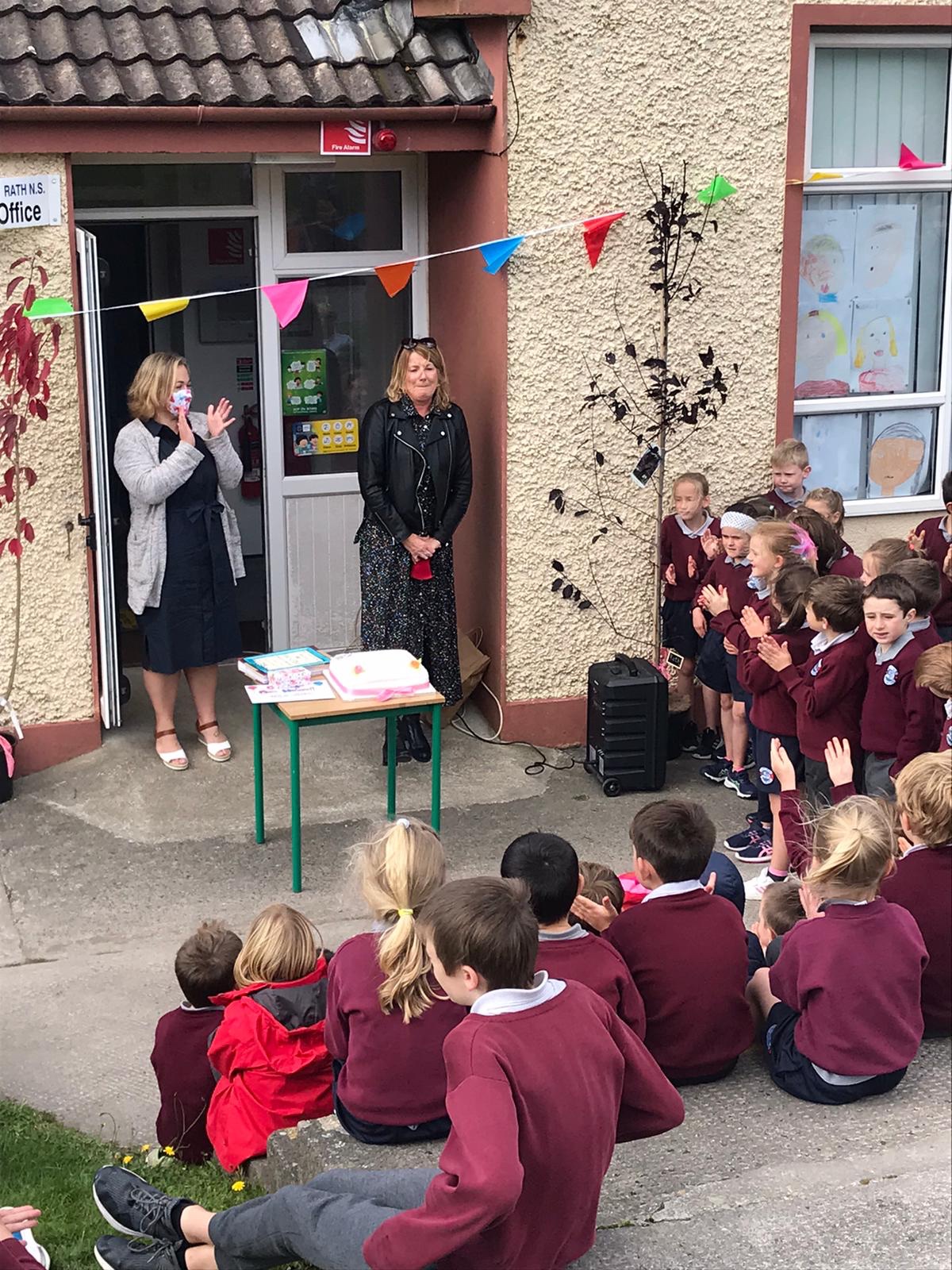 To mark this special occasion, but taking into account our current restrictions, we planned a little out door event for the children only. To begin with, every pupil wrote or drew a memory of their time with Mrs Nolan and these were compiled in a scrap book along with photos of her throughout the years. We presented her with this album as a surprise and also two trees, one which we planted in school to remind us of Mrs Nolan and one for her to plant at home to remember us by! We had some tasty cake from Fields and the Whooley children made a presentation on behalf of the parents association & all the parents & pupils of Rath NS. Ms Collins made a speech and the pupils sang a lovely rendition of “You are my Sunshine”. To finish off, we gave her a guard of honour up the steps as she headed off. She promised to call back and visit often though and we wish her all the very best for her retirement. Here’s to many years of good health & happiness spending time doing the things she loves with the people she loves! ❤️