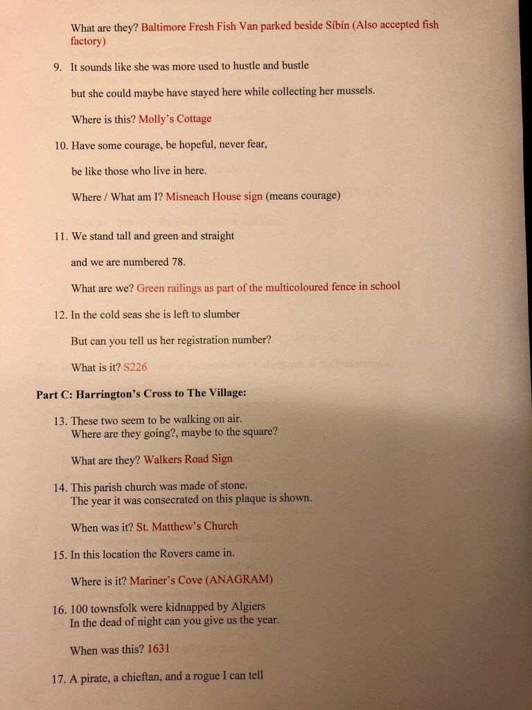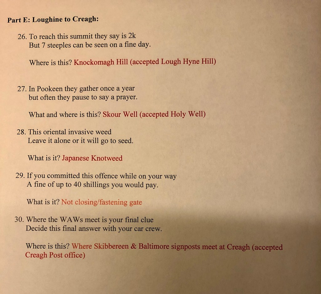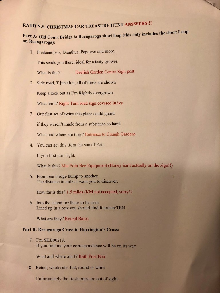 Thanks so much to all those who came out and supported our Car Treasure Hunt today. It was wonderful to see such a turn out and the fantastic effort people put into decorating their cars, brilliant team names, lovely pictures and photos. We had a super collection of spot prizes so your efforts will be rewarded!! Heartiest congratulations to the Festive Fastnet Fliers aka the Daly Family who came out on top with 28/30, followed in 2nd place by 4 teams on 26/30 -Tom Bushe & family, Sarah Connolly & family, Bernie O’ Driscoll & family (The Quarantinees!) & the Cooney Garretts (Sherlock Ho-Ho-Homies!) These were followed by another 7 teams on 25. Super work so well done to all! A huge thank you to Siobhán & Carol for putting the course together.