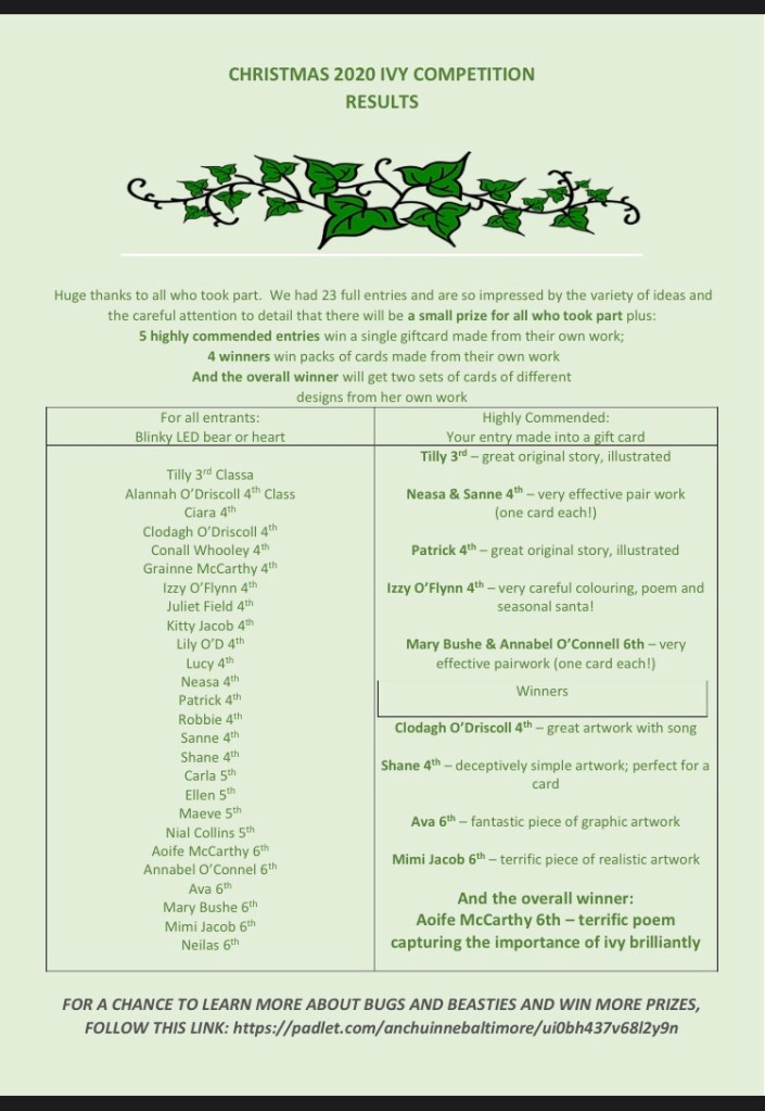 Congrats to all those who took part in the latest work with Baltimore Tidy Towns. Please find results below. Lots more info and competitions to be found on their link at the end of the photo!