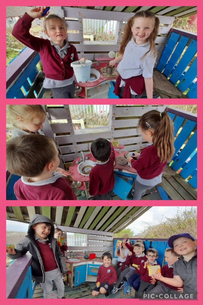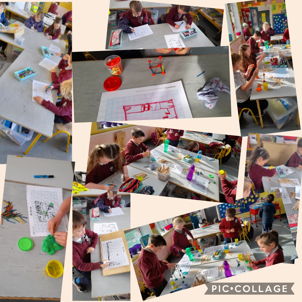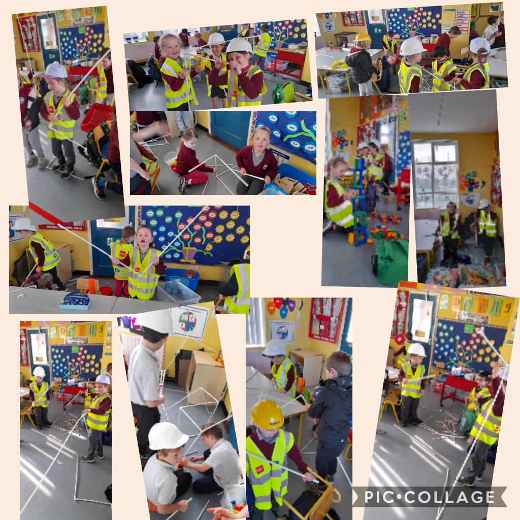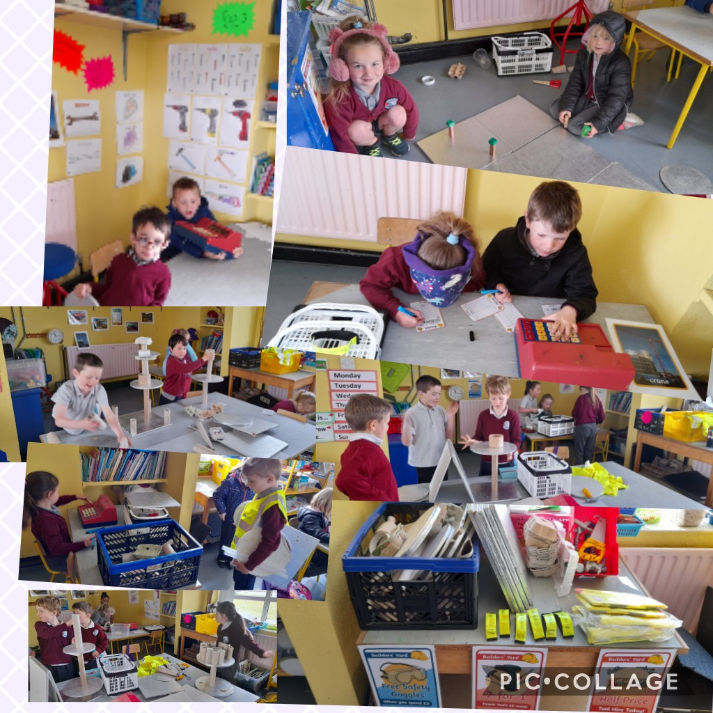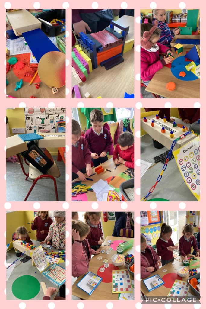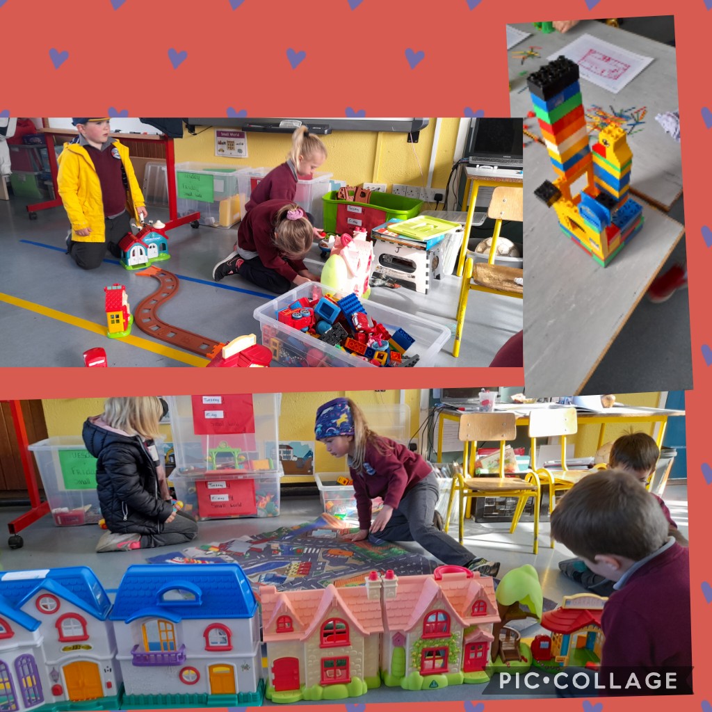 The infants have been exploring the Aistear theme of ‘Building’ – very appropriate given all the activity happening outside their classroom! They have four stations and move to a different one each day.