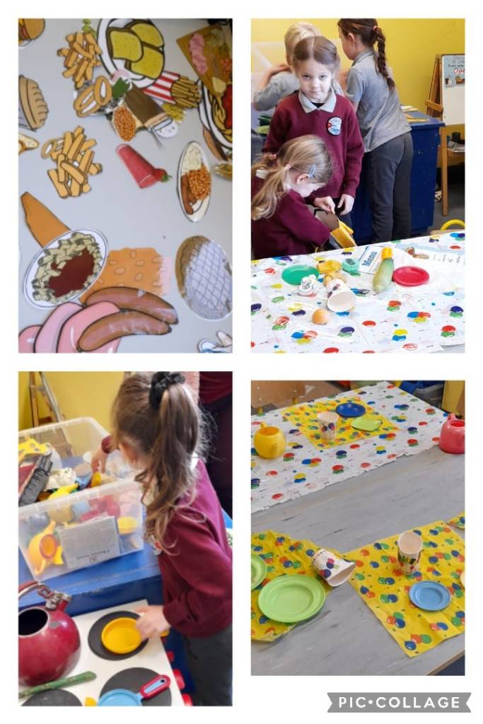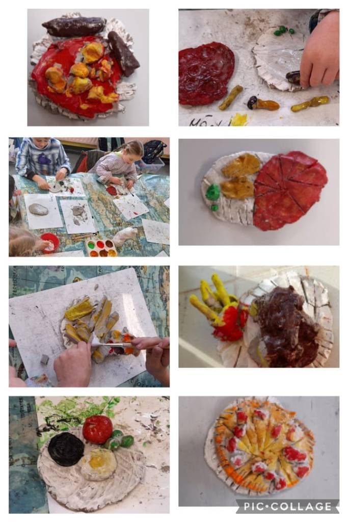 ‘At the restaurant’ art – dinner made with clay and then painted by the infants