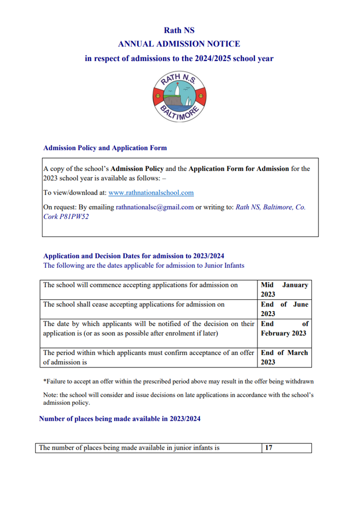 We are now enrolling for the school year 2024/25. We would like to invite you and your child to visit our school on Friday, February 9th between 2-4pm. You can either enrol on the day or take a form away with you for completion at home.